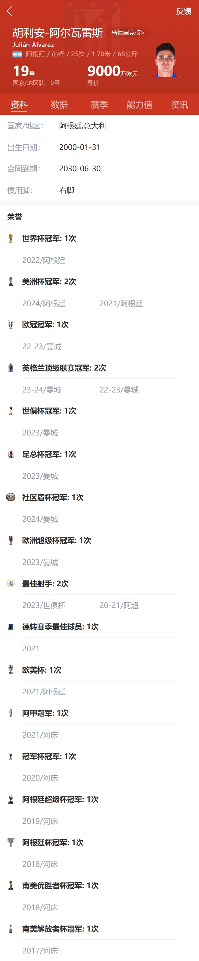 会无冠吗?25岁小蜘蛛拿17冠,当前西甲落后9分、今夏还有世俱杯 频道:足球专题 日期:2025-04-15 浏览:112 04月03日讯 国王杯半决赛,马竞总比分4-5巴萨无缘决赛。马竞前锋阿尔瓦雷斯本赛季各项赛事出战46场,打进23球,送出5次助攻。阿尔瓦雷斯目前生涯已经拿了17冠上个月马竞点球大战不敌皇马止步欧冠1/8决赛,本月马竞总比分4-5巴萨无缘国王杯决赛,目前马竞只剩联赛和新世俱杯,西甲29轮过后马竞落后榜首的巴萨9分,本赛季西甲还剩9轮比赛。新世俱杯将于今夏6月开赛,马竞与巴黎、博塔弗戈、西雅图海湾人同组。 关键词:今夏西甲 上一篇:米体:纽卡有意尤文中卫加蒂,并与阿森纳竞争弗拉霍维奇 下一篇:英媒预测切尔西战热刺首发:马杜埃凯、帕尔默、杰克逊先发 相关文章 迈阿密中场:梅西告诉我们要多控球,所以下半场我们才踢得更好 为世界杯拒沙特高薪!UOL:吉达联合想签吉马良斯,但被后者拒绝 一仁币!拜仁4000万卖赫拉芬贝赫&现身价7500万 如今4000万卖特尔 基米希:萨内去土耳其令我感到惊讶,但他有自己的理由